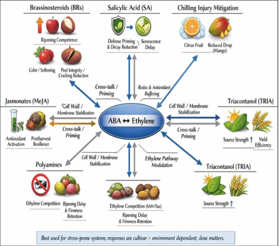 Figure 1: “Emerging regulators as stress-quality modulators: cross-talk with ABA and ethylene and major fruit outcomes,” Acharya (2026). (Credits: DOI:10.22271/ed.book.3526)