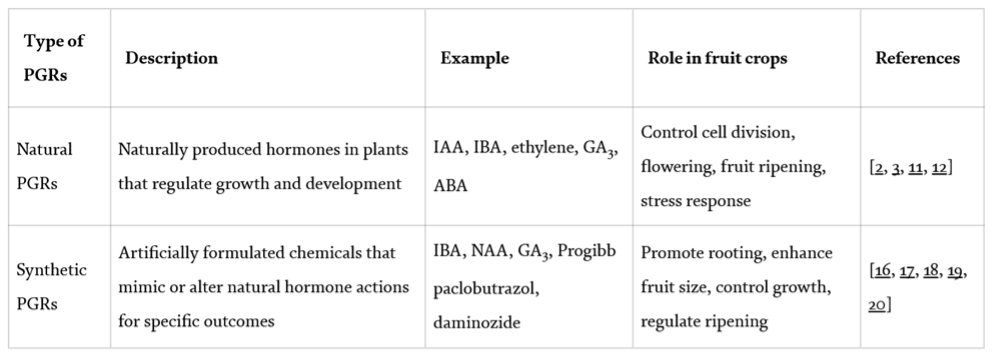 Table 1: Natural and synthetic PGRs and their role in fruit production and quality, Shivanda et al. (2025). (Credits: DOI: 10.5772/intechopen.1010639)