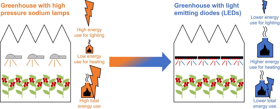 Figure 1: Comparison of energy use by conventional and LED lights for horticulture, Katzin et al. 2021. (Image credits: https://doi.org/10.1016/j.apenergy.2020.116019)