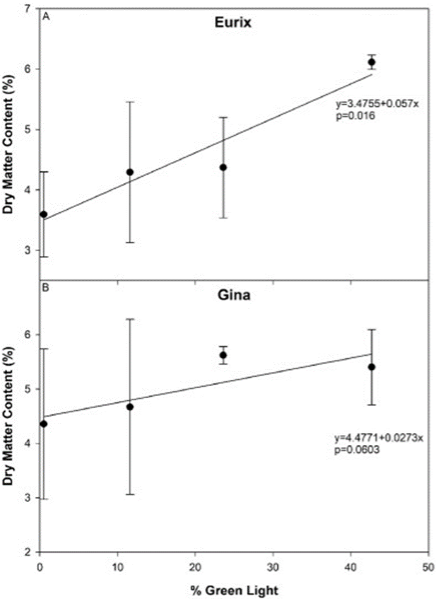 Figure 2: “Dry matter content of pepper fruit samples from ‘Eurix’ (panel A) and ‘Gina’ (panel B), respectively, grown under lighting treatments with different percentages of green light,” Lanous et al. 2022. (Image credits: https://doi.org/10.1016/j.scienta.2022.111350)