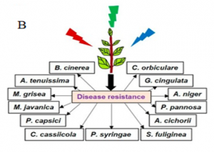 Figure 3: “Effect of LEDs on (A) bioactive compounds production and (B) disease resistance against different pathogens,” Adapted from Hasan et al. 2017. (Image credits: https://doi.org/10.3390/molecules22091420)