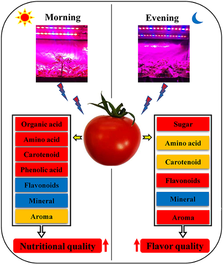 - Flavor: The light and dark phases influence fruit flavor development as hormone composition can alter. Therefore, flavor consistency can be controlled by adjusting light recipes and timing of exposure after understanding the hormone compositions and concentrations at different times of the day. For example, in Figure 4, evening exposure to LEDs improves the flavor of tomatoes.