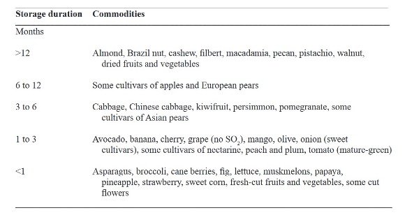 Table 1: CA storage potential at optimum temperatures and RH for fresh produce, Gross et al. 2016. (Credits: https://www.ars.usda.gov/arsuserfiles/oc/np/commercialstorage/commercialstorage.pdf)