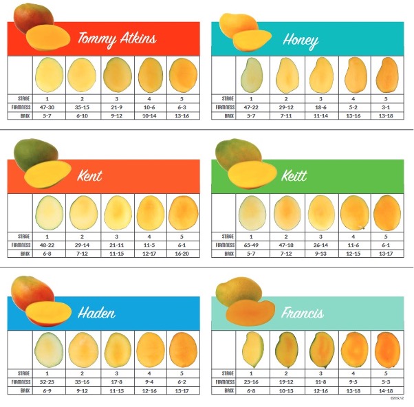 Color charts for cultivars are available in each country. In the US, 90% of mangos must reach stage 2 or higher to meet a maturity index. Figure 3 shows the optimum colors for Tommy Atkins, Honey, Kent, Keitt, Haden, and Francis.