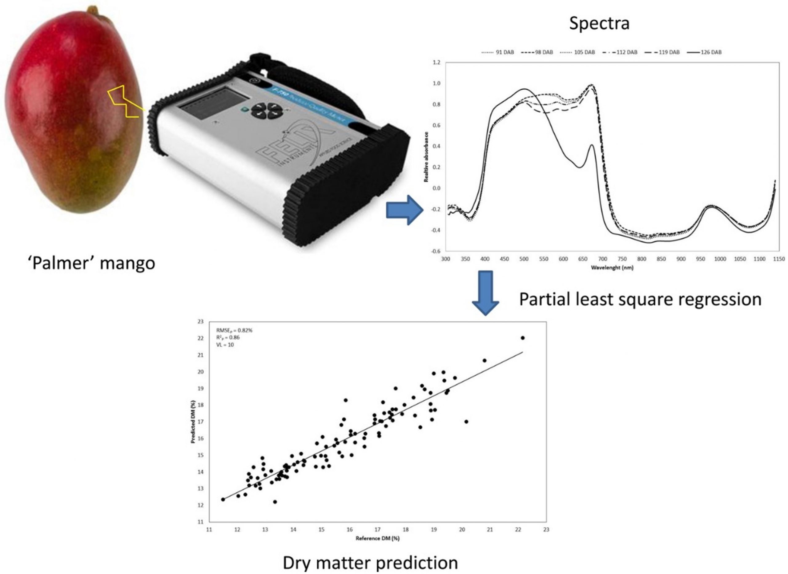 Figure 4: Preparing a model for mango cultivars using NIR spectroscopy devices like Felix 750 Fruit Quality Meter, Neto et al. 2017. (Image credits: https://doi.org/10.1016/j.postharvbio.2017.03.009)