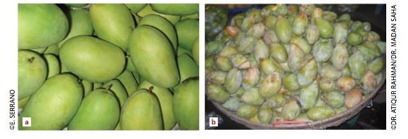 Figure 1: “Fullness of cheeks, flat shoulder at stem end (a) and presence of bloom as indices of maturity (b)” FAO 2018. (Image credits: FAO).