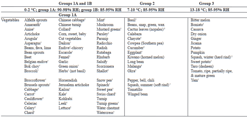 Table 2: Vegetables classified according to their temperature, relative humidity needs, and sensitivity to ethylene, Gross et al. 2016. (Credits: https://www.ars.usda.gov/arsuserfiles/oc/np/commercialstorage/commercialstorage.pdf)