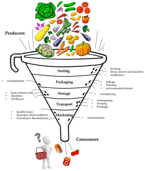 Figure 1. Causes of postharvest losses along the supply chain, Palumbo et al. 2022. (Image credits: https://www.mdpi.com/2304-8158/11/23/3925