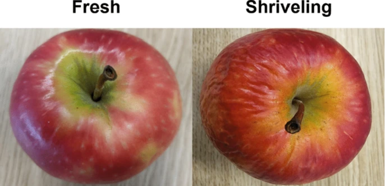 Water loss is a significant constraint in the long-term storage of apples. Fruits that lose 5-10% of their water suffer quality loss. It negatively affects appearance, causing shriveling and reducing taste by diminishing crispness and juiciness, as shown in Figure 2. Moreover, the reduction in salable weight and storage time can decrease income for growers and other stakeholders. Apples stored at ambient temperature or without precooling have more water loss. For example, 28% more water loss occurs in apples that are not precooled.