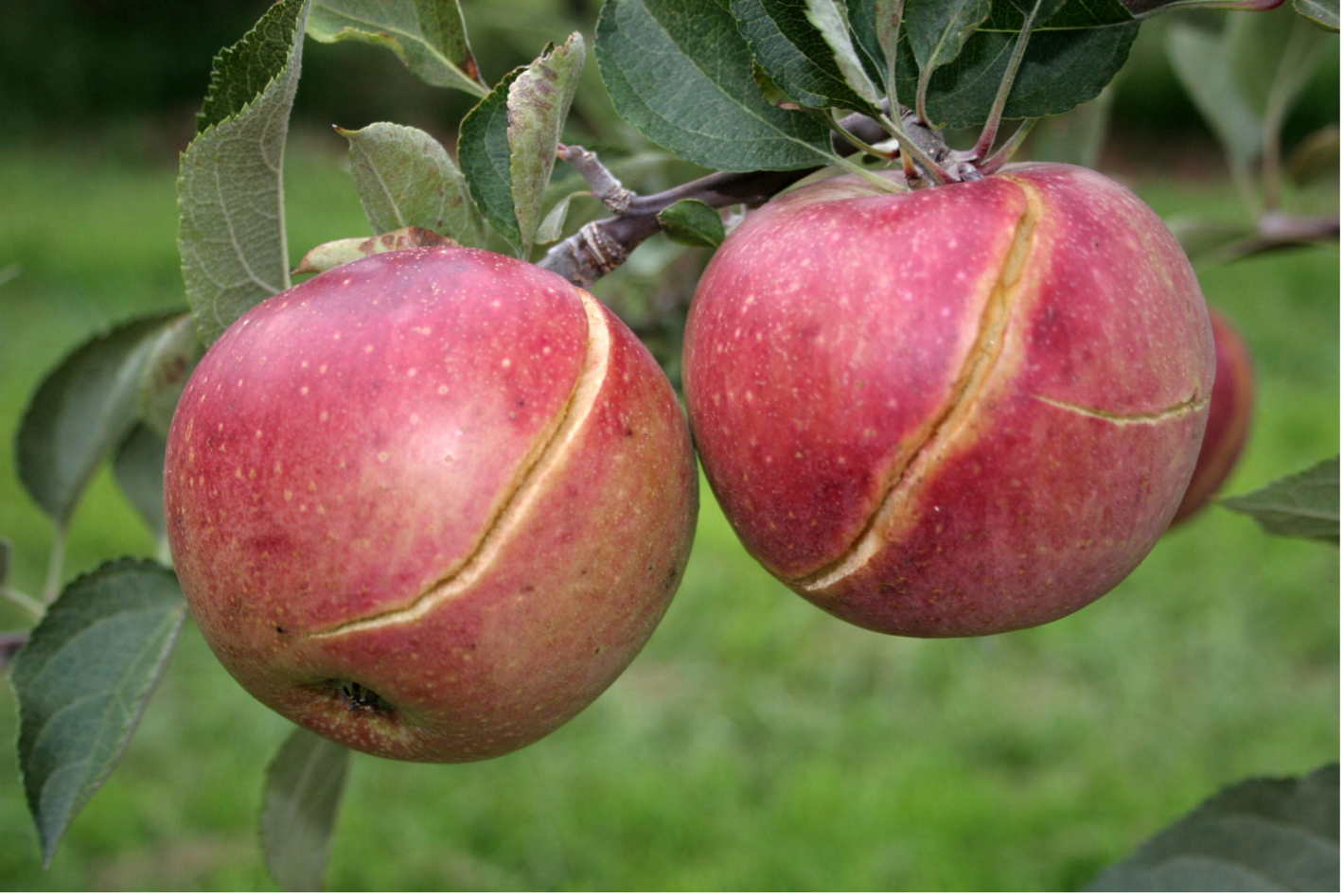 Figure 3: Preharvest fruit cracking, John Strang, University of Kentucky. (Image credits: https://fruitscout.mgcafe.uky.edu/fruit-cracking-stem-end-splitting-and-internal-ring-cracking-apple)
