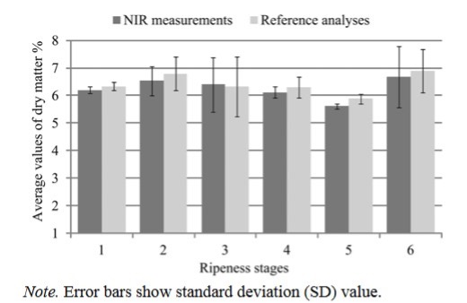 Figure 2. :” Amount of dry matter at different ripeness stages measured using near-infrared (NIR) spectroscopy and reference analyses,” Radzevičius et al. (2016). (Image credits: DOI 10.13080/z-a.2016.103.012)