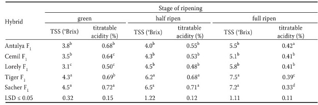 In Romania, five hybrids, Antalya, Cemil, Lorely, Tiger, and Sacher, have characteristic total soluble solids, as shown in Table 1.