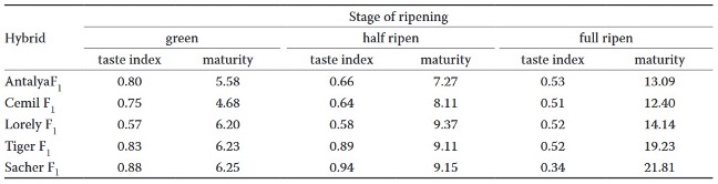 In Romania, an additional harvest index is used. It is the ratio of taste and flavor index. The flavor index equals [(TSS/20 × titratable acidity) + titratable acidity]. The taste and harvest index for three stages (green, half-ripe/turning, and red ripe) are given in Table 2.