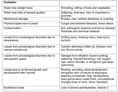 Physiological and biological factors that lead to a loss of quality and yield include respiration, transpiration, senescence, ethylene production, harvest maturity, and preharvest factors (see Table 1).