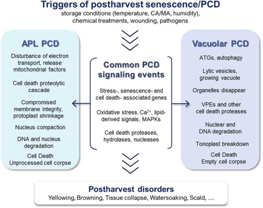 PCD is a process strictly controlled by genetics as a response to stress. In the postharvest stage, storage conditions (extreme temperatures, low oxygen, high carbon dioxide), pathogens, mechanical damage, and physical and chemical treatments are stresses that trigger PCD.
