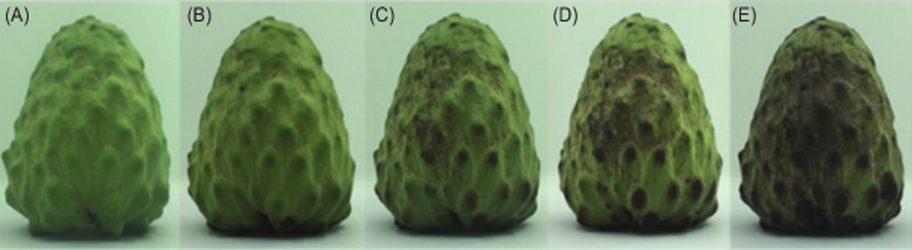 Figure 1: “Five stages of postharvest atemoya fruit senescence. (A) at harvest, (B) 1d, (C) 3d, (D) 5d, (E) 7d,” Gong et al. (2020). (Image credits: DOI: https://doi.org/10.15586/qas.v12i4.786).