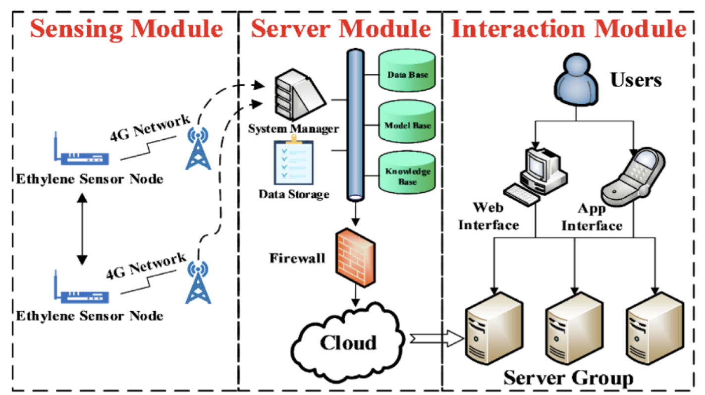 Sensors: These include sensors for ethylene and other environmental factors that affect ethylene generation in fresh produce. The sensors collect data for analysis and are part of the IoT.