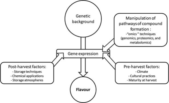 Besides the chemicals, flavor is also influenced by cultivars or genetics, soil and climatic factors, farm management, postharvest handling, treatments, use of an edible coating, and type of packaging, see Figure 2. Attempts to improve flavor should do so without compromising on other quality traits.