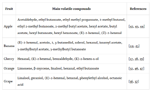 Table 1: Key volatile compounds in some common fruits, Gonçalves et al. 2018. (Image credits: https://www.intechopen.com/chapters/61698)