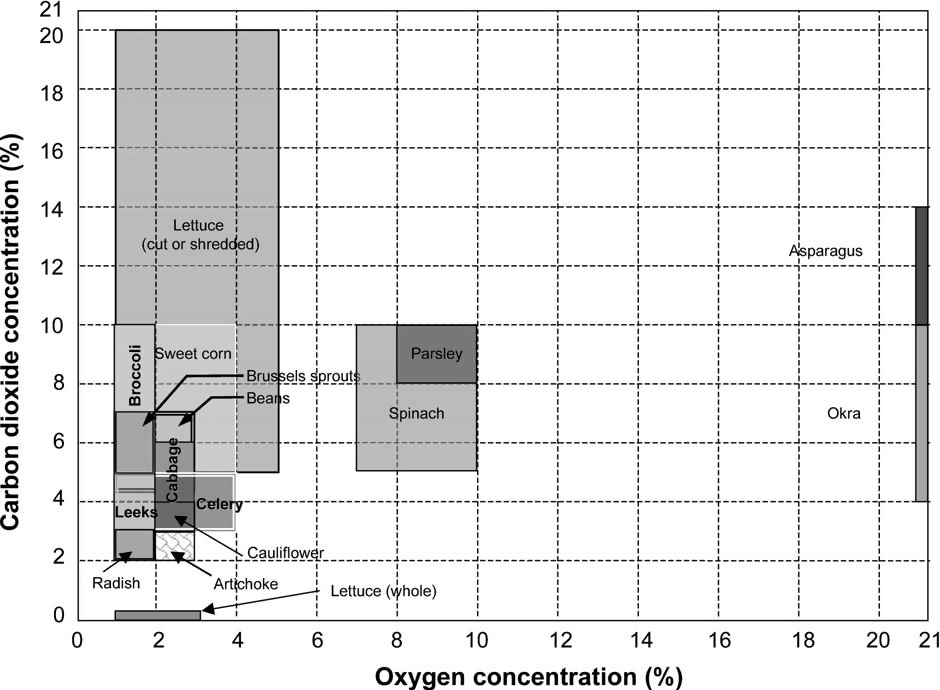 Figure 2: “Recommended oxygen and carbon dioxide ranges for the storage of some harvested vegetable commodities (Saltveit, 2002).” (Image credits: http://ucce.ucdavis.edu/files/datastore/234-2197.pdf)