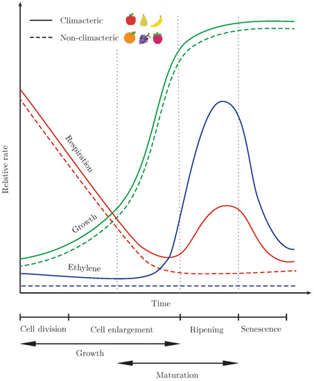 Paul, V.; Pandey, R.; Srivastava, G.C. The fading distinctions between classical patterns of ripening in climacteric and non-climacteric fruit and the ubiquity of ethylene—An overview. J. Food Sci. Technol. 2011, 49:1–21. DOI: doi:10.1007/s13197-011-0293-4.